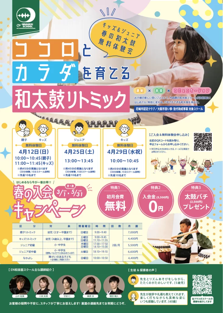 EN和楽器スクールは、2歳からシニア層までどなたでも始められます。またキッズやシニア世代向け、初心者から経験者向けなど幅広いプログラムをご用意しています。